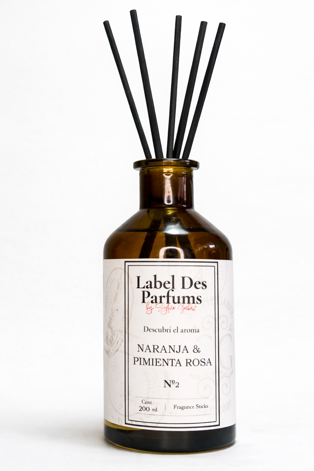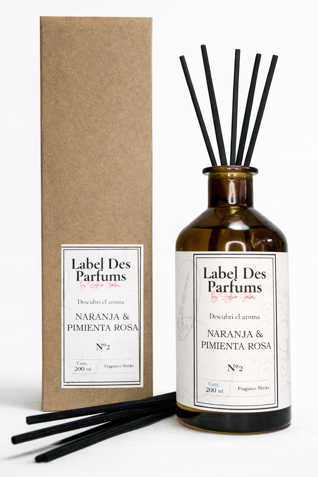 Frasco de vidrio ambar x 200ml con varilas 6 rattan – Estuche